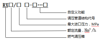 如:调压箱的设计流量为1.65Nm³/h.则型号标识的公称流量为1.6Nm³/h;调压箱是设计流量为4567 Nm³/h。则型号标识的公称流量为4500Nm³/h。